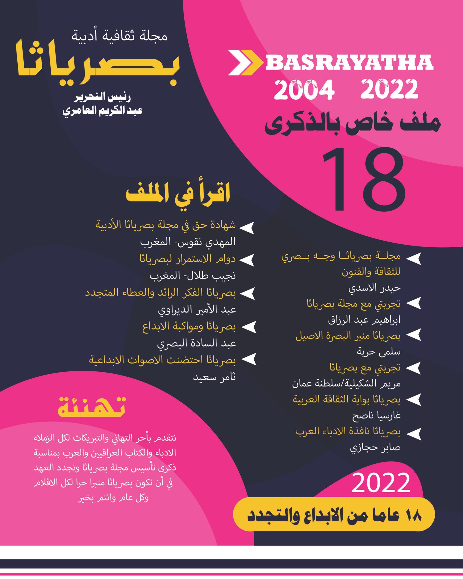 بمناسبة مرور ١٨ عاما على تأسيس مجلة بصرياثا اتقدم باحر التهاني والاستمرار بالنجاح الدائم وكل التوفيق.